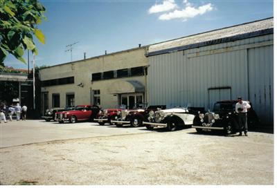 The cars lined up outside a Classic Car Museum.