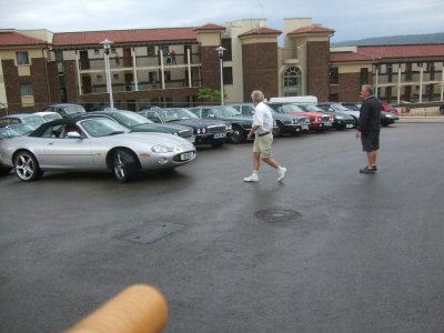 Friday 17th was our last day at the hotel and the morning was taken up with the “photocall” for all the cars and participants. By now the weather had really deteriorated and it was getting wetter and wetter. I drove our car up out of the garage to join the line-up and then had to erect the hood rather rapidly as the rain was now relentless. It took quite some time to arrange all the cars. The best vantage point for photos was at the top of a steep bank. I have to admire all the men who were brave enough to clamber up there, not realising how difficult it would prove to get down again!!!!!!!!!!!!!!!!!!! We have some interesting video.