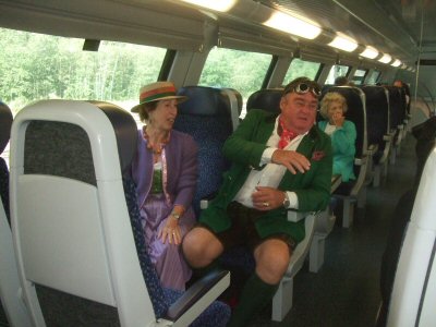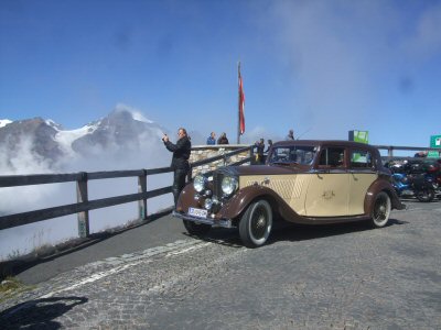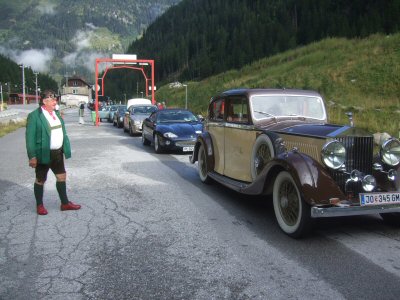 One of the main highlights of the holiday, the climb over the Grossglockner and an unexpectedly early start for a holiday at 08.30 hrs! We were marshalled into a convoy, behind the 1936 20/25 Rolls, to head for the train at Bockstein, just south of Bad Gastein, for the trip through the Alps to Mallnitz. On the way, we had a conducted tour all through Bad Gastein and this gave us an excellent view of most parts of the town. At the terminal, We drove the cars onto the train and then went to sit in the passenger carriages for the trip through the mountains.