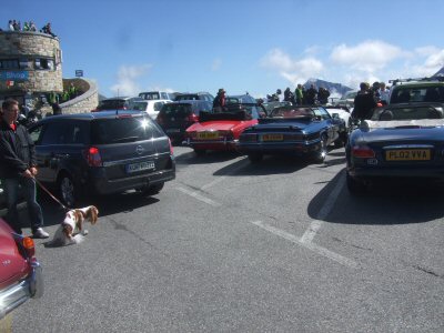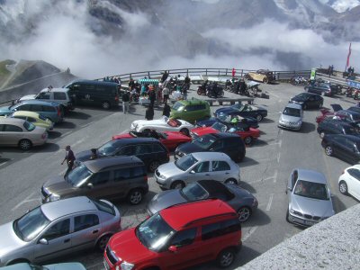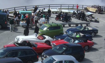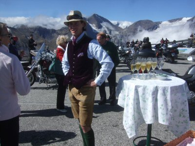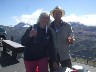 After leaving the train, we stopped to put the car hood down. The next stage of the journey took us to Winklern and the start of the 107 Grossglockner road. There was slight consternation at the toll booth where we were booked in as a party and tickets had to be handed out to each car. The drive up the pass was a delight, with very gentle curves and wonderfully wide road. Our first halt was a "comfort" stop not far from the top of the pass. The final ascent to the viewing point at Edelweissspitze (2,571 metres) was unusual in that we became stuck in a traffic jam. It was unbelievably busy and parking was quite a problem. However, it was all worth the effort for the Champagne reception that the Blumscheins had organised for us at the top. This included delicious snacks as well! The view was spectacular, especially so because we had bright sunshine but also clouds "flowing" over the mountains: all very dramatic. I remember as a child being driven over this pass with my parents on the way to Venice in about 1958. It was every bit as impressive this time round.